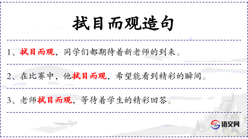 - 拭目而观:形容非常专注地观看,期待看到精彩的事物。