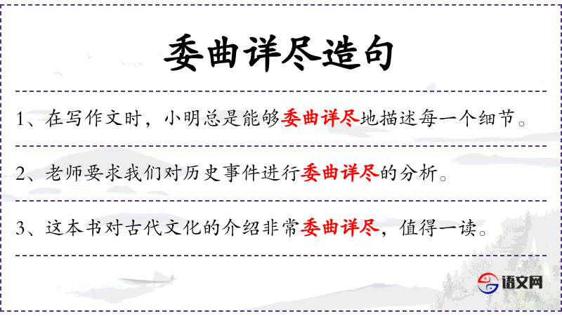 1. 【委曲详尽】 指对事情的开始经过和结尾了解得十分详细而周密。