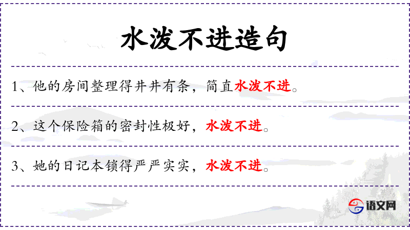 2. 【水泼不进】 - 比喻一个人不接受意见或者一个单位拒绝和外界来往。