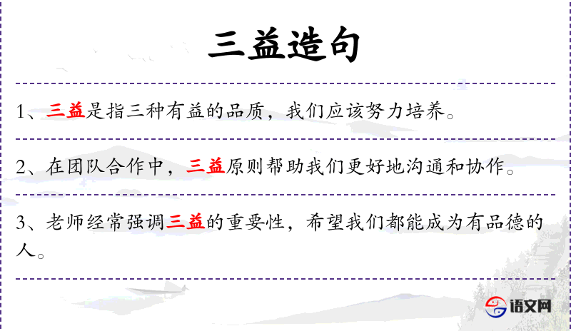 谓直﹑谅﹑多闻。语本《论语.季氏》"孔子曰益者三友,损者三友。友直,友谅,友多闻,益矣。" 2.借指良友; 指梅﹑竹﹑石。