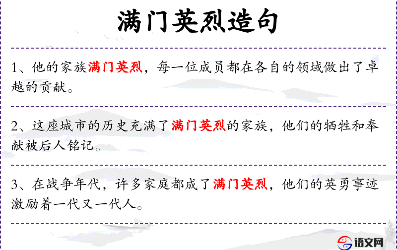 1. 【满门英烈】 满门:全家;英烈:英雄人物。全家人都是英雄人物。