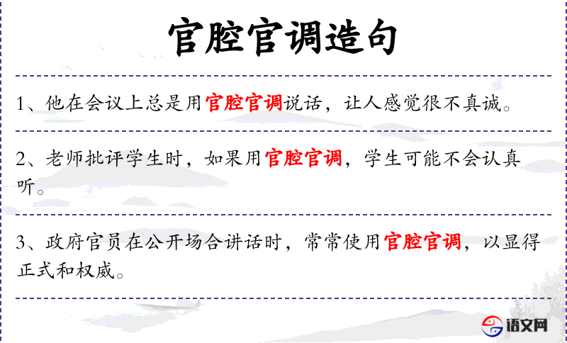 - 官腔官调:指官方或正式场合使用的语言风格,可能显得生硬、不自然。
