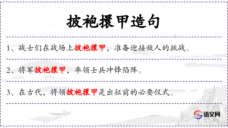 句子:“在古代,将领披袍擐甲是出征前的必要仪式。”