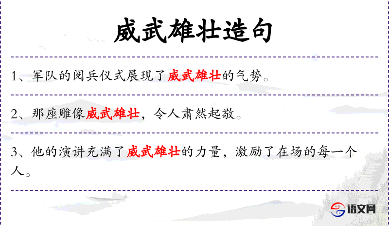 1. 【威武雄壮】 威力强大,壮盛有气势。