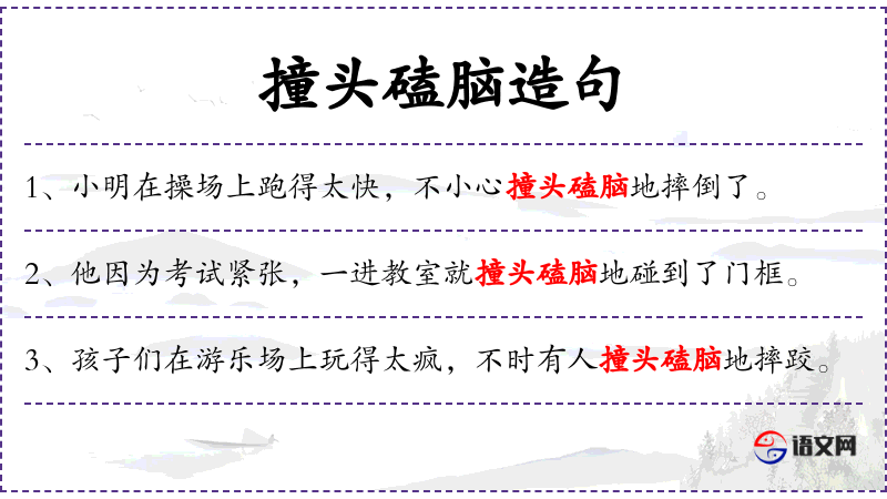 - 撞头磕脑:形容词短语,描述摔倒时的状态。