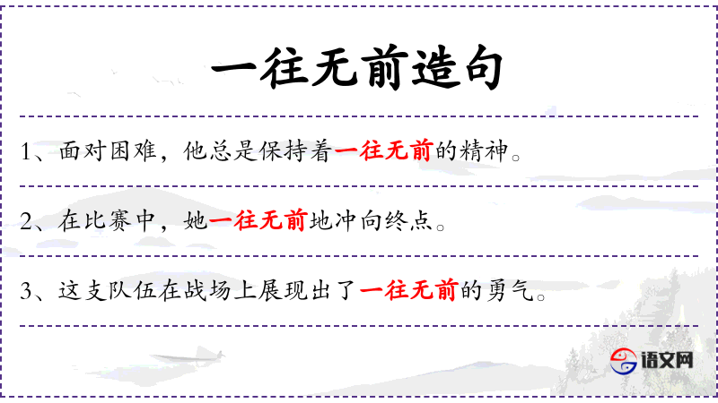 1. 【一往无前】 一往:一直向前;无前:前面什么也挡不住。一直往前,无所阻挡。形容勇猛无畏地前进。