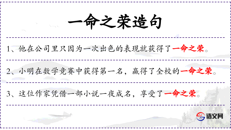 - 一命之荣:指因某项成就而获得的荣誉或名声。