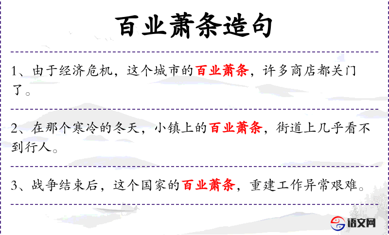 3. 【百业萧条】 萧条:冷落、凋敝。指各行各业都很冷落、不兴旺。形容社会的衰败。