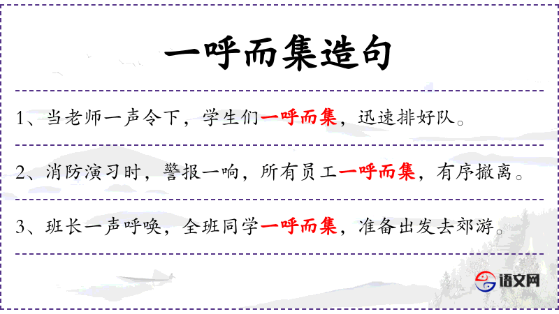 1. 【一呼而集】 呼:呼唤;集:聚集。呼唤一声,人们就聚集到一起。