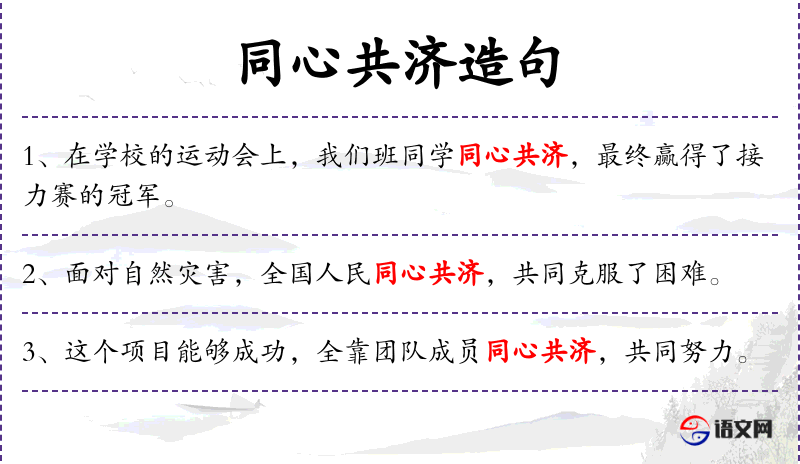 - 同心共济:成语,意思是大家心往一处想,共同努力,同义表达有“团结一致”。