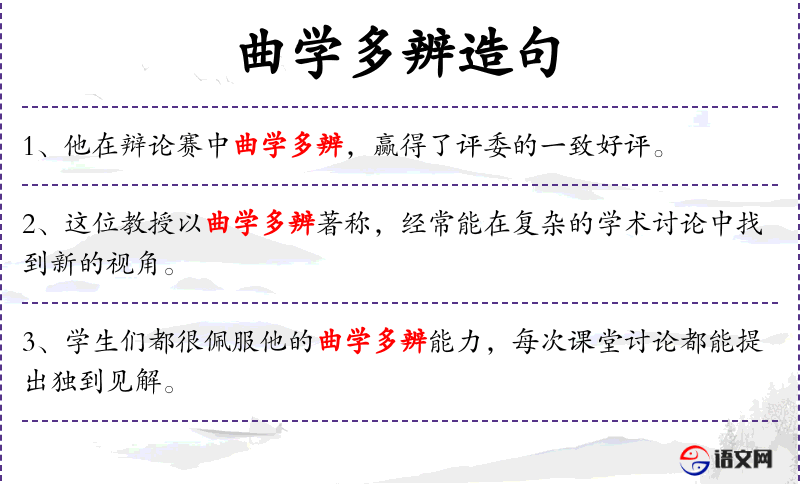 1. 【曲学多辨】 - 曲学:知识不广泛且头脑顽固的人;辨:通“辩”,争论。比喻学识浅薄的人喜欢毫无意义的争辩。