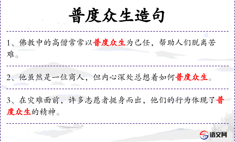 6. 【普度众生】 佛家语,认为大众营营扰扰,如溺海中,佛以慈悲为怀,施宏大法力,尽力救济他们以便登上彼岸。