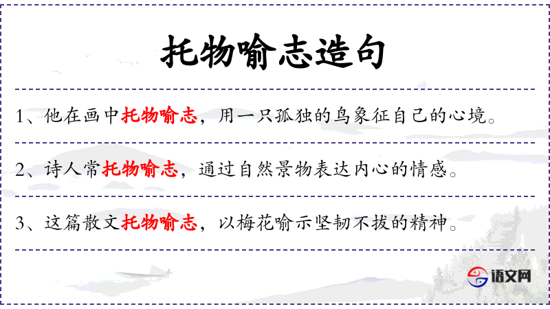- 托物喻志:通过描述具体事物来表达抽象的思想或情感。