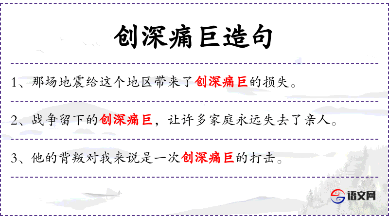 1. 【创深痛巨】 创:创伤。创伤大,痛苦深。比喻遭受很大的伤害和痛苦。