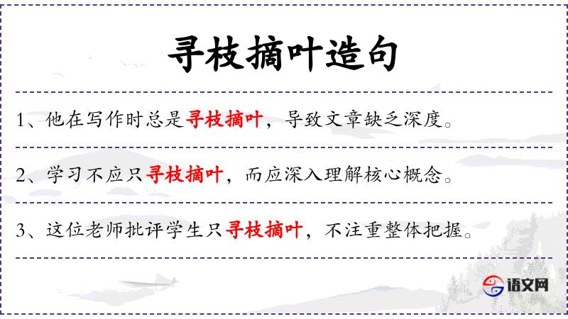 - 文化意义:“寻枝摘叶”在**文化中常被用来比喻只关注细节而忽略整体,这与“全面”和“整体”观念相悖。
