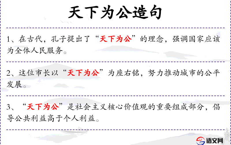 - 使用“天下为公”这样的成语增加了句子的文化深度和隐含意义。