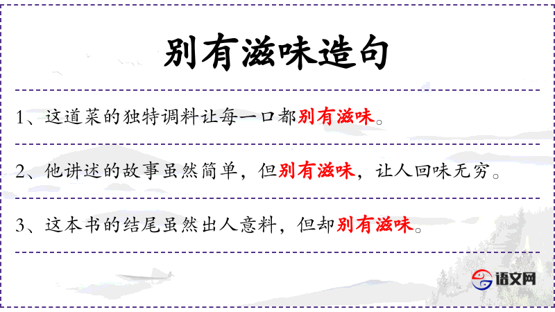 1. 【别有滋味】 原意是另有一种别人无法体会的离愁别恨的滋味,指亡国之痛。后泛指文学艺术的情调、意蕴另有种动人的美感和趣味。