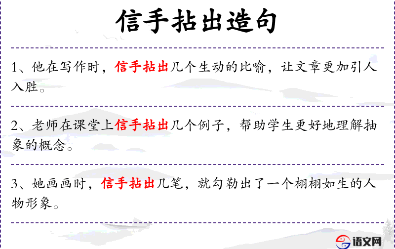 - 状语:画画时、信手拈出几笔