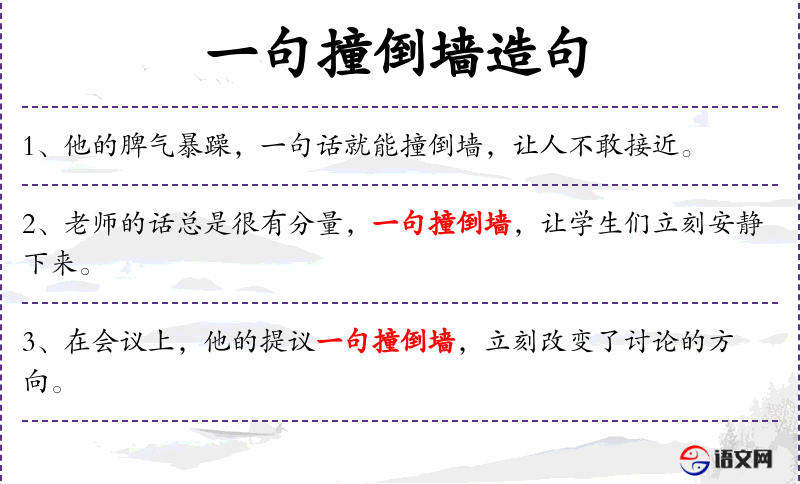 1. 【一句撞倒墙】 - 一句话可以把墙壁撞倒。比喻言语生硬、莽撞。