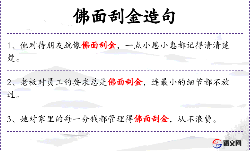 “佛面刮金”是一个成语,源自**传统文化,比喻做事非常细致、一丝不苟。这个成语的使用体现了汉语中丰富的比喻表达方式。