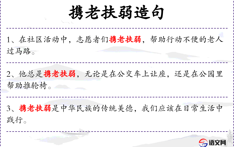 - 携老扶弱:这是一个成语,意思是帮助老人和弱者,体现了尊老爱幼的传统美德。