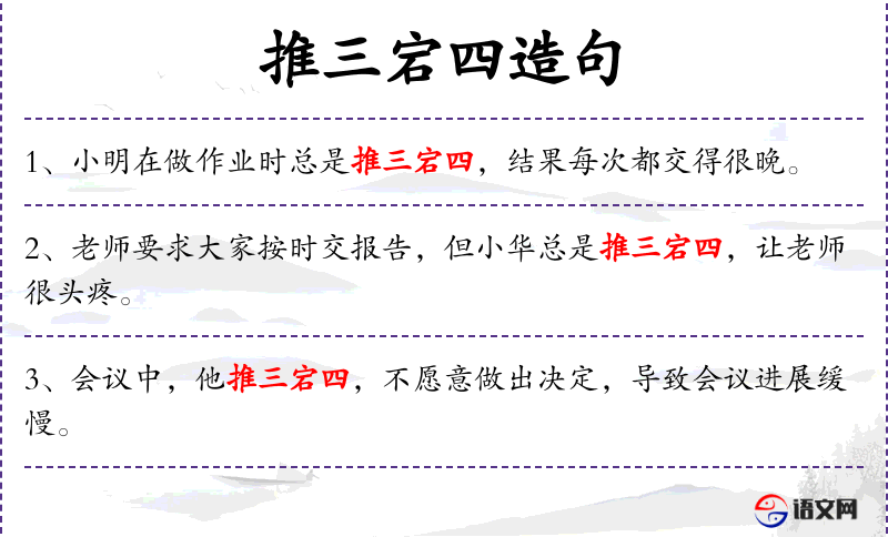 在**文化中,老师通常被赋予较高的权威,学生被期望遵守老师的指示。句子中的“推三宕四”是一个典型的中文表达,用来形容拖延行为,反映了中文中对时间管理和责任感的重视。
