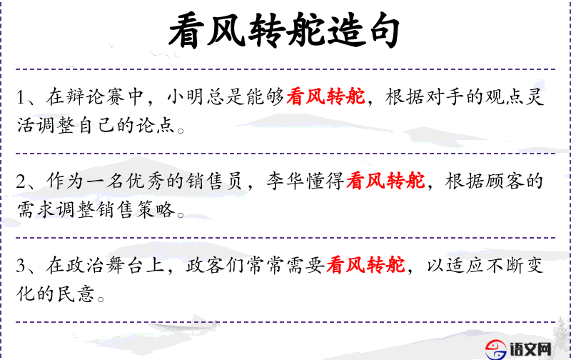 4. 【看风转舵】 看:观察;舵:船控制方向的装置。看着风向掌握船舵。比喻随着形势转变方向,调整对策。