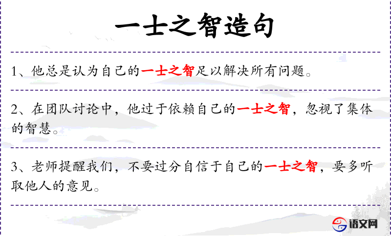 1. 【一士之智】 - 智:智慧。一个人的智慧。形容有限的才智。