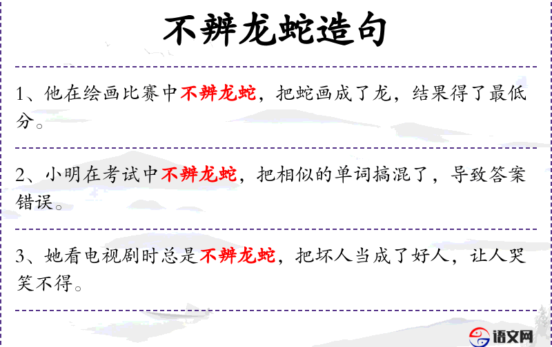 1. 【不辨龙蛇】 - 辨:辨别,明察。是龙是蛇不加分辨。形容不分优劣,不识好坏。