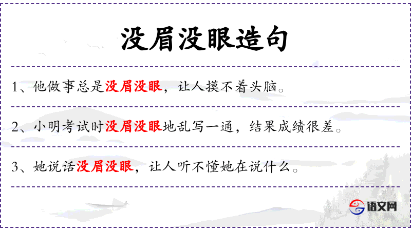 3. 【没眉没眼】 - 眉目不清,形容一塌糊涂的样子。也指没有脸面。