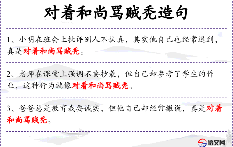- 英文:"The teacher emphasizes in class not to plagiarize, but himself refers to students' assignments, such behavior is like scolding a monk while being a thief oneself."