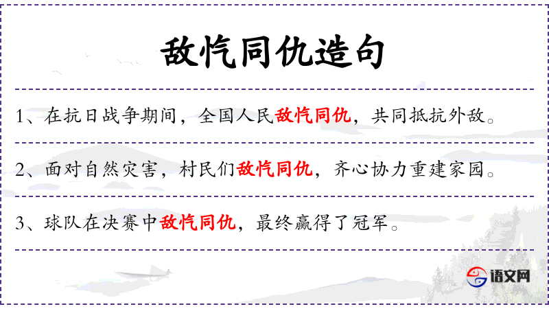 1. 【敌忾同仇】 全体一致痛恨敌人。