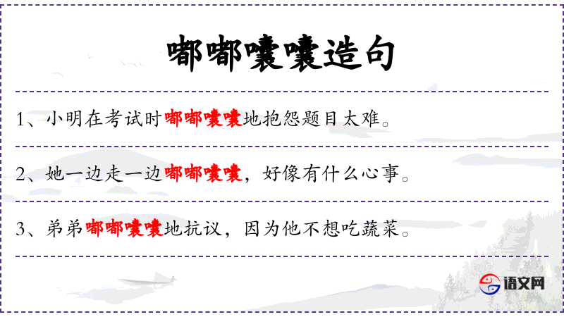 - 嘟嘟囔囔:形容说话声音低沉、含糊不清,常用来形容老年人或心情不佳时的说话方式。