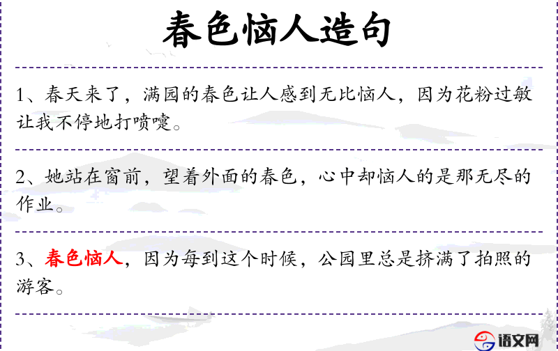 - 春色:名词,春天的景色。 *. 恼人:形容词,令人烦恼的。
