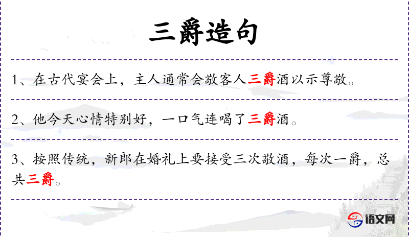 1. 【三爵】 - 三杯酒。爵,雀形酒杯; 三种酒杯; 三只鸟雀。爵,通"雀"。