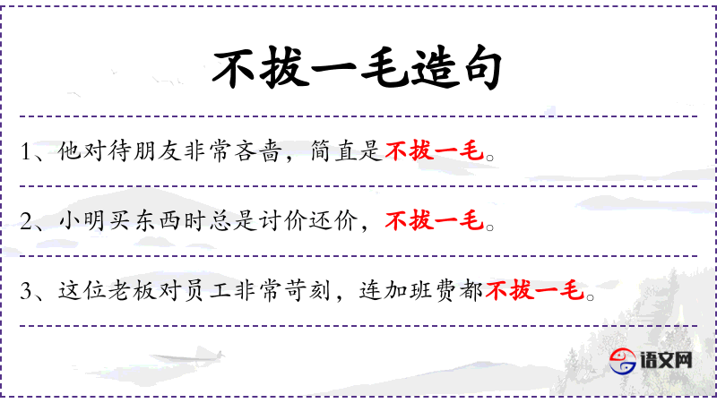 - 成语:“不拔一毛”源自《孟子·梁惠王上》,比喻非常吝啬。