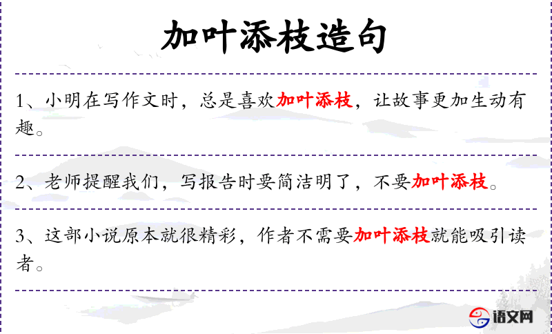 - 文化背景:在**文化中,“加叶添枝”是一个常用的成语,用来形容不必要的修饰。