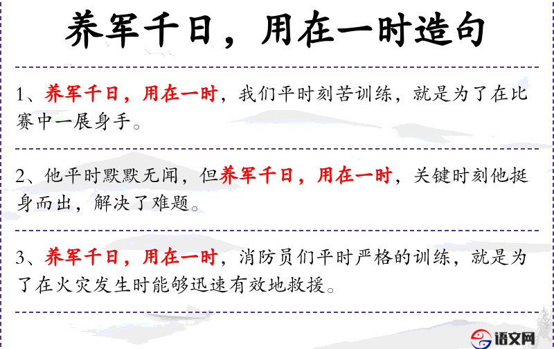 - 养军千日,用在一时:这是一个成语,意思是长期的准备和训练是为了在关键时刻发挥作用。