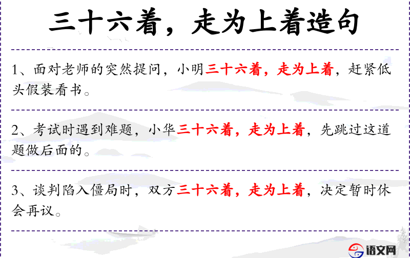 句子中的“三十六着,走为上着”是**传统文化中的成语,源自《三十六计》,是古代兵法中的策略总结。这个成语在现代汉语中常用来比喻在不利情况下选择撤退或放弃是明智的。