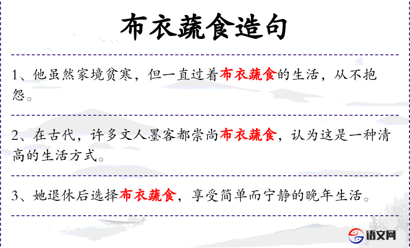- 布衣蔬食:简朴、清贫、朴素