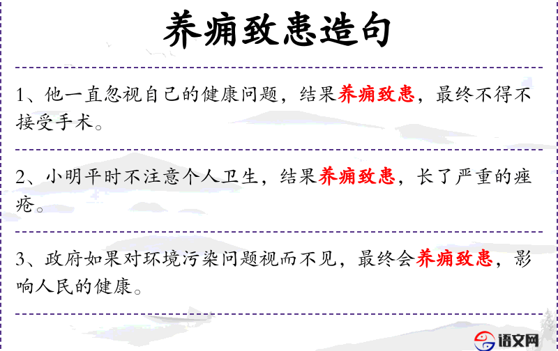- 养痈致患:成语,比喻对小问题不及时处理,导致大问题。