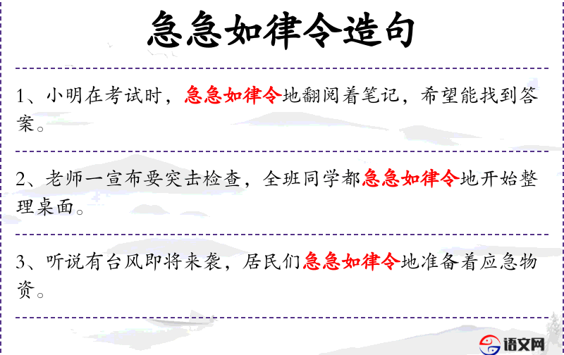 - “急急如律令”是一个成语,源自古代道教咒语,用来形容行动迅速,符合命令。