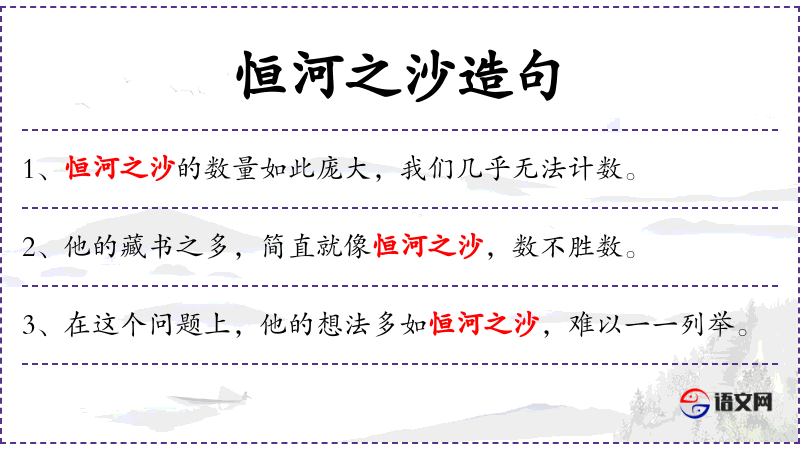 - 成语“恒河沙数”用来形容数量极多,不可计数。