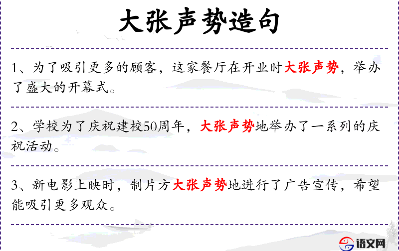 1. 【大张声势】 大造声势,扩大影响。