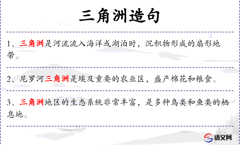 1. 【三角洲】 在河流入海或入湖的河口地区,因河水所携泥沙淤积而形成的冲积平原,一般呈三角形或弓形。