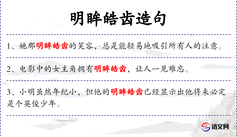 - 状语:在学校的才艺展示中,以明眸皓齿和优雅的舞姿
