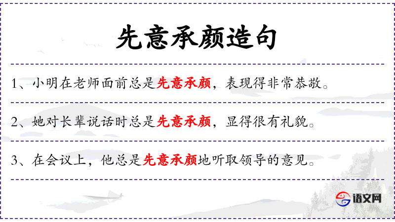 - 先意承颜:表示在行动或言语之前就已经考虑到长辈的意愿和感受,以示尊敬。