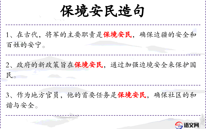 - 保境安民:保护国家的边境和人民的安全。