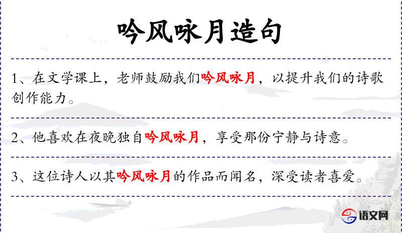 句子中的“吟风咏月”是**传统文化中的一个成语,源自古代文人对自然景物的吟咏,体现了文人雅士的生活情趣和审美追求。