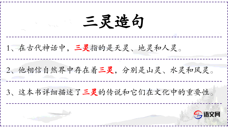 指日﹑月﹑星; 指天﹑地﹑人; 指天神﹑地祇﹑人鬼; 指灵台﹑灵囿﹑灵沼; 道教称三魂为三灵。
